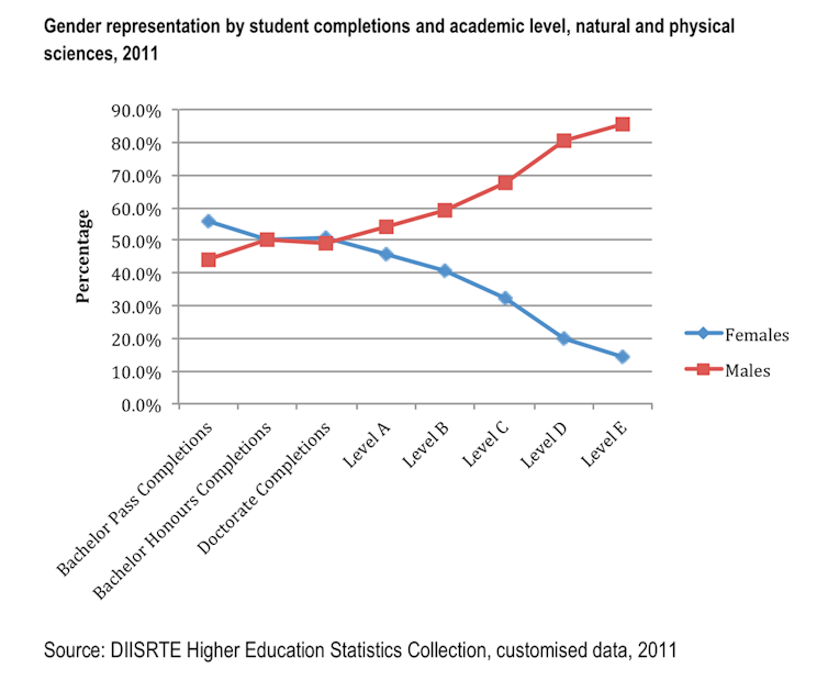 The exact shape of a similar graph of progression in different parts of the world, in specific subjects, at specific institutions etc. is not the same (they might sometimes show less of an issue, other times more). But this graph is indicative of the overall challenge facing females in the sciences, and related subjects like Engineering and IT.